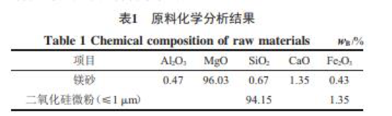 中頻爐爐襯作為感應爐的重要組成部分,不但直接影響熔煉質(zhì)量,而且還影響生產(chǎn)成本。堿性爐襯具有抗堿性熔渣侵蝕的優(yōu)異性能,不污染鋼液,原料來(lái)源豐富,生產(chǎn)工藝簡(jiǎn)單,使用方便等優(yōu)點(diǎn)。目前,以硼酸為燒結劑的堿性爐襯應用廣泛,但由于硼酸的強烈助熔作用,導致?tīng)t襯的使用壽命短、熔煉成本高。本試驗以二氧化硅微粉為燒結劑,利用其顆粒小、活性大、填???? 粉。該二氧化硅微粉是冶煉金屬硅或硅鐵時(shí),產(chǎn)生的揮發(fā)性SiO或Si氣體遇空氣迅速氧化而成的非結晶相無(wú)定形圓球狀顆粒,表面較為光滑,粒度小于1 μm的占87%以上,平均粒徑在0.2~0.3 μm,比表面積為19.2 m2/g,活性高?;瘜W(xué)成分分析見(jiàn)表1。表1 原料化學(xué)分析結果