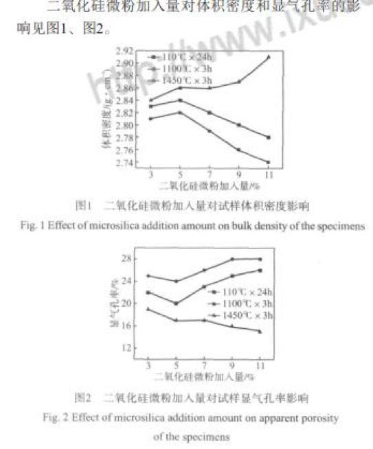 在110 ℃×24 h條件下烘干時(shí),當二氧化硅微粉加 入量小于5%時(shí),由于二氧化硅微粉的顆粒小,分散性 好,可以填充顆粒與顆粒間的空隙[1],這使材料顆粒堆 積的致密度逐漸提高,氣孔率減少,體積密度逐漸增 加 (圖1);隨著(zhù)二氧化硅微粉加入量的增加,材料中的氣孔率逐漸減少,材料致密度逐漸增加,體積密度 就逐漸增大;當二氧化硅微粉加入量大于5%時(shí),隨著(zhù) 二氧化硅微粉加入量的逐漸增多,二氧化硅微粉充填 空隙后出現過(guò)剩導致材料堆積致密度下降;同時(shí)大量 的二氧化硅微粉水化產(chǎn)物烘干后失去自由水和部分結 合水導致材料氣孔率逐漸增大 (圖2),從而使試樣的 體積密度逐漸減小。 在1 100 ℃×3 h條件下燒結,試樣體積密度普遍小 于110 ℃×24 h樣品的體積密度 (圖1),而氣孔率普遍 高于1 10 ℃×24 h樣品的 (圖2)。因為在1 100 ℃時(shí), 由于燒成溫度低,試樣達不到燒結溫度,材料內部形 成的液相量少,不足以填充空隙以提高材料的致密度; 在此溫度下,試樣的主要變化是二氧化硅微粉水化產(chǎn) 物的完全脫水,二氧化硅微粉加入量越多,二氧化硅 微粉水化產(chǎn)物脫水引起氣孔率增加而導致體積密度減 小的影響就越強,故隨著(zhù)二氧化硅微粉加入量的增大, 試樣的體積密度呈減小的趨勢;同時(shí)作為結合劑的二 氧化硅超微粉在升溫過(guò)程中發(fā)生晶型轉化,引起試樣 體積膨脹[2],體積密度變小。 在1 450 ℃×3 h條件下燒結,試樣體積密度普遍增 大 (圖1)。隨二氧化硅微粉加入量的增加,試樣體積 密度逐漸增大,氣孔率逐漸降低 (圖2)。在1 450 ℃ 下,鎂質(zhì)澆注料中的MgO和SiO2生成鎂橄欖石[3],即: 2MgO+SiO2→2MgO·SiO2,這使材料燒結,體積收縮, 結構致密程度提高,體積密度增大。隨二氧化硅含量 的增加,2MgO·SiO2生成量逐漸增加,體積密度逐漸 增大,氣孔率逐漸降低。