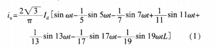 中頻電源注入電網(wǎng)的諧波主要是由整流裝置產(chǎn)生的.這里以三相6脈動(dòng)全控橋式整流電路為例來(lái)分析其諧波含量忽略三相橋式晶閘管整流電路換相過(guò)程和電流脈動(dòng).假定交流側電抗為0.直流電感為無(wú)窮大,利用傅里葉分析方法,將電流負、正兩半波的中點(diǎn)作為時(shí)間零點(diǎn),可推出交流側a相電流的表達式: