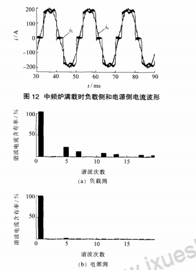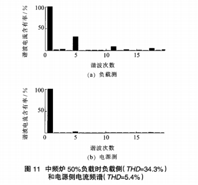 對6脈中頻爐在空載、5O%負載、滿(mǎn)載3種不同階段的電源側電流波形及頻譜分析可知.在未使用APF進(jìn)行諧波治理前.中頻爐投入運行時(shí).電源側電流波形出現嚴重畸變,諧波電流組成主要為5次。7次.11次,13次諧波電流.諧波畸變率較大針對中頻爐滿(mǎn)載的典型情況,補償前系統電流的5次,7次,11次,13次諧波含有率明顯超高.尤其5次諧波含有率達到21.49,7次諧波電流達l1.77%諧波畸變率THD高達27.9%。投入APF進(jìn)行諧波治理后,5次,7次,11次,l3次諧波諧波含有率迅速下降,電流波形接近于正弦波,電能質(zhì)量得到顯著(zhù)改善。針對中頻爐滿(mǎn)載的典型情況,補償后諧波畸變率THD下降到3.8%,符合國家電能質(zhì)量公用電網(wǎng)諧波標準,補償效果良好。