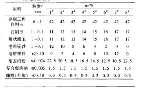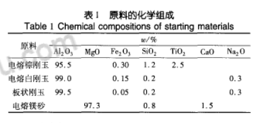 以電熔棕剛玉、白剛玉、板狀剛玉、鎂砂為顆粒料,鎂砂細粉、剛玉細粉為粉體,添加高溫復合促燒劑,以硼酸為外加劑。主要原料的化學(xué)組成如表1所示。