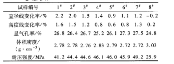 將所有試樣分別在1000、1200、1350和1600cI=熱處理3h后,觀(guān)察其燒結情況,同時(shí)將經(jīng)l350oC3h燒后的試樣4A一_4F再經(jīng)1600oC3h熱處理。對1600℃3h燒后的各試樣進(jìn)行直徑線(xiàn)變化率和高度線(xiàn)變化率(GB/T3997.1一l998)、體積密度(GB/T2997-2000)以及耐壓強度(GB/T5072-2008)檢測,同時(shí)并對現場(chǎng)使用后的干式搗打料殘襯進(jìn)行顯微結構觀(guān)察。