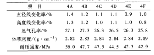 經(jīng)l350oC3h預燒后的試樣4A-_4F再經(jīng)1600℃3h燒后的性能檢測結果見(jiàn)表5。由表5可見(jiàn),隨復合促燒劑加入量的減小,試樣的直徑線(xiàn)變化、高度線(xiàn)變化、耐壓強度在逐漸減小,體積密度在逐漸增加。綜合比較而言,試樣4c的強度較高,線(xiàn)變化比較合理,該試樣在1000以下燒后幾乎無(wú)強度,呈粉狀,1200oC燒后稍微有點(diǎn)強度,1350oC燒后有一定的強度,1600oC燒后有較高的燒結強度,可以滿(mǎn)足中頻爐搗打料各方面要求。因此,選擇4c配比作為工業(yè)現場(chǎng)試驗用干式搗打料的配比。