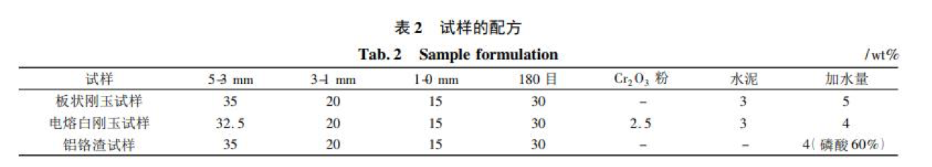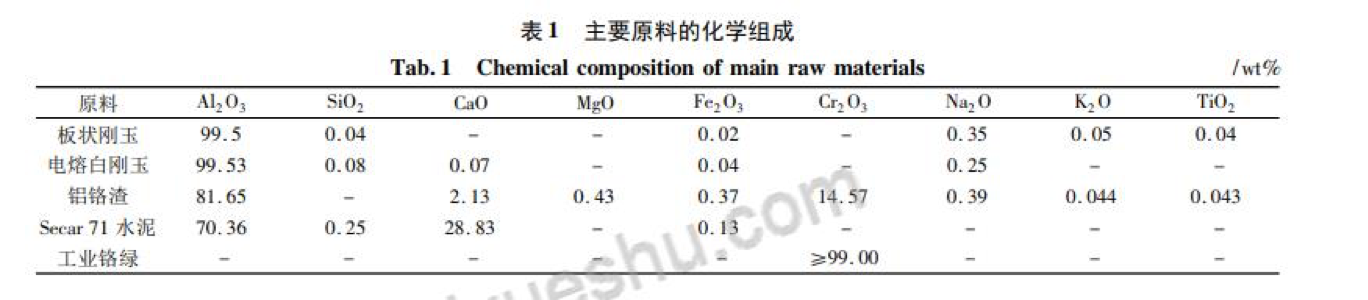 實(shí)驗用主要原料有板狀剛玉( 5 ~ 3 mm、3 ~ 1 mm、1 ~ 0 mm 和≤0. 088 mm) 、電熔白剛玉( 5 ~ 3 mm、3 ~ 1 mm、1 ~ 0 mm 和≤ 0. 088 mm) 、鋁鉻渣( 5 ~ 3 mm 、3 ~ 1 mm、1 ~ 0 mm 和≤ 0. 088 mm) 、純鋁酸鈣水泥( Secar 71) 、磷酸溶液( 濃度 60% ) 和工業(yè)鉻綠。板狀剛玉體積密度 5. 53 ~ 5. 57 g·cm - 3,吸水率為 1. 0% ~ 1. 09% ,顯氣孔率約 4. 1% ~ 4. 8% ; 電熔白剛玉體積密度 3. 54 ~ 3. 70 g·cm - 3,吸水率為 2. 43% ~ 2. 58% , 顆粒料的顯氣孔率約 6. 1% ~ 7. 4% ; 鋁鉻渣顆粒體積密度為3. 29 ~ 3. 37 g·cm - 3,吸水率為 4. 2% ~ 4. 6% , 顯氣孔率 10. 3% ~ 12. 1% 。原料的化學(xué)組成見(jiàn)表 1。