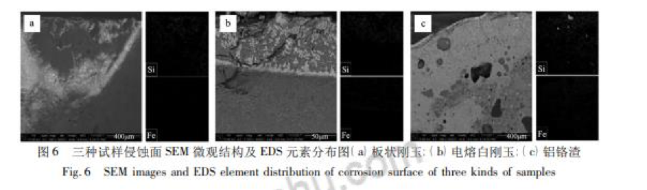 從圖 6b 中可以看出,試樣抗熔渣侵蝕和滲透能力均較強。當中頻爐熔渣與試樣接觸時(shí),在工作層表面形成了 一個(gè)明顯的邊界層,這是由于基質(zhì)中含有一定量的 Cr2O3,一方面 Cr2O3 與剛玉骨料形成固溶體,鋁鉻固溶體 的存在可阻止熔渣向內部的侵蝕滲透,顯著(zhù)提高其抗 SiO2-FeO 渣侵蝕性能。另一方面渣中的 FeO 和 SiO2 與 Al2O3 和 Cr2O3 成分反應生成鐵鉻、鐵鋁尖晶石、莫來(lái)石等高熔點(diǎn)化合物,生成的高熔點(diǎn)化合物填充于基 質(zhì)和氣孔從而提高了材料的致密性度并且能有效的抵抗爐渣的侵蝕。圖 6c 為鋁鉻渣經(jīng)爐渣侵蝕后的 SEM 和 EDS 圖片,由于試樣氣孔率較高,且骨料雜質(zhì)含量高,導致高溫燒成時(shí)液相量和基質(zhì)遷移所造成的空隙增加。 高溫下,中頻爐熔融的爐渣和液相沿著(zhù)氣孔、裂紋和空隙滲入材料內部導致?tīng)t渣對試樣的侵蝕深度的急劇增加。