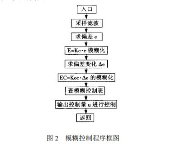 中頻爐溫度的模糊控制器是模糊控制系統的核心 ,它是一 種利用專(zhuān)家知識和操作者經(jīng)驗設計的專(zhuān)家控制系 統 ,設計時(shí)不用數學(xué)解析模型來(lái)描述受控系統的 特性。在本溫度控制系統設計中 ,采用二維模糊 控制器 ,即以偏差 e 和偏差變化率Δe 作為模糊控制器的輸入變量 ,把加熱操作量作為輸出變量。 在模糊控制過(guò)程中 ,同時(shí)把偏差和偏差的變化率 作為模糊輸入量 ,這種方法不僅能保證系統控制 的穩定性 ,而且還可減少超調量和振蕩現象。根 據受控系統的實(shí)際情況 ,確定輸入變量的測量范 圍和輸出變量的控制作用范圍 ,以確定每個(gè)變量 的論域 , Ke、Kec 和 Ku 分別為輸入和輸出變量的 量化因子和比例因子。先經(jīng)限幅處理 ,再經(jīng)量化 處理就得到了 E 和 EC。根據當前已求得的 E 和 EC ,直接查詢(xún)模糊控制表就獲得控制量的變化值 ΔU ,將該變化值ΔU 乘以比例因子 Ku ,即可得到 當前的實(shí)際控制量增量Δu。再將該增量和前一采 樣時(shí)刻的實(shí)際控制量相加 ,就得到目前應實(shí)施的 控制動(dòng)作 ,即 uk = uk - 1 + Ku ·ΔU ,其模糊控制 程序框圖如圖 2 所示。