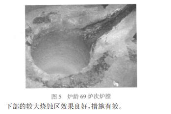 本次試驗爐齡 79 爐次達到了預期壽命,說(shuō)明試 驗方案合理,試驗成功。從試驗過(guò)程中觀(guān)察到:中期 燒結有效地減緩了爐襯的損耗速度,措施有效;兩次 中修均達到了預期目的,使用短坩鍋中修應對爐膛下部的較大燒蝕區效果良好,措施有效。