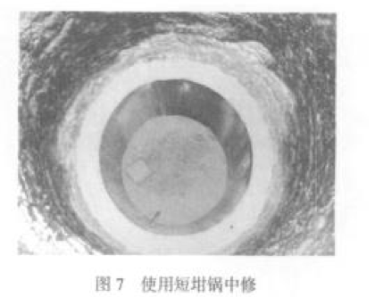 2009 年 4 月進(jìn)行了第二次試驗。在整個(gè)中頻爐開(kāi)爐過(guò) 程中,有過(guò) 5 次較長(cháng)時(shí)間的停爐,中頻爐爐膛未出現大裂 紋。在爐齡 25 爐次時(shí),進(jìn)行第二次燒結,燒結工藝是 在燒結溫度保溫 2h。在爐齡 42 爐次時(shí),在爐襯中下 部出現較大的燒蝕區,進(jìn)行第一次中修,中修工藝是 使用短坩鍋和爐襯材料修筑爐膛底部,經(jīng)過(guò)短暫燒 結后正常開(kāi)爐(圖 4)。在爐齡 69 爐次時(shí),爐膛情況正 常(圖 5),使用短坩鍋進(jìn)行第二次中修。在爐齡 79 爐 次時(shí),因中頻爐設備原因停止試驗,爐膛良好。