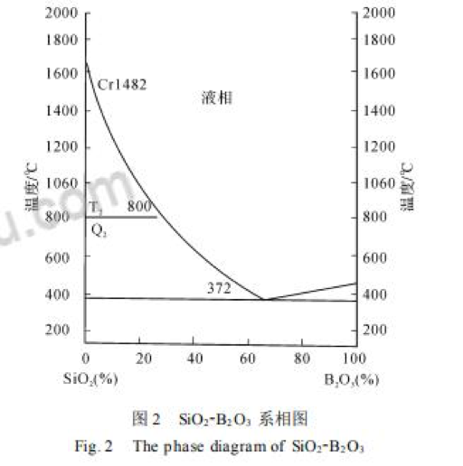 中頻電爐烘爐與燒結要達到2個(gè)目的:①排除爐襯材料中的水分;②完成石英砂的晶型轉變且不開(kāi)裂,最終獲得由α2方石英形成的燒結層、半燒結層和未燒結層3層結構的爐襯,在不同的溫度完成不同的任務(wù),在不同的溫度區間控制不同的升溫速度。燒結過(guò)程是在高溫下使石英砂料的接觸面上出現液相結合,形成連續的燒結網(wǎng)絡(luò )。通過(guò)網(wǎng)絡(luò )使整個(gè)石英料聯(lián)成一個(gè)整體[2]。燒結后的爐襯斷面分為燒結層、半燒結層、未燒結層。燒結層要求密度大、強度高、表面裂紋少,砂粒顆粒之間全部熔化,燒結網(wǎng)絡(luò )均勻完整。燒結層的厚度約占全壁厚的37%~48%。半燒結層是燒結層和未燒結層之間的過(guò)渡區,在該區內部分顆粒的接觸面開(kāi)始熔化,燒結網(wǎng)絡(luò )不完全。該層的作用是緩沖燒結層的應力,阻止燒結層內產(chǎn)生的裂紋向外延伸。半燒結層的厚度約占全壁厚的28%~31%。未燒結層是半燒結層和感應圈之間有一層完全沒(méi)有燒結的原始砂料。這層砂料起著(zhù)絕熱的作用,當爐襯在加熱和冷卻時(shí),也起著(zhù)體積膨脹和收縮的作用。未燒結層的厚度占全壁厚的27%~32%[3]。助燒結劑采用硼酸,它的主要作用是降低石英砂的燒結溫度。硼酸的化學(xué)式為H3BO3,當硼酸加熱脫水而成硼矸,它的分子式為B2O3。SiO22B2O3系相圖[4]見(jiàn)圖2,由圖可知,SiO2的熔點(diǎn)為1710℃,B2O3的熔點(diǎn)為450℃,B2O3與SiO2形成的共晶物只有372℃,就是說(shuō)B2O3作為石英質(zhì)料的助燒結劑時(shí),在372℃就會(huì )出現液相。