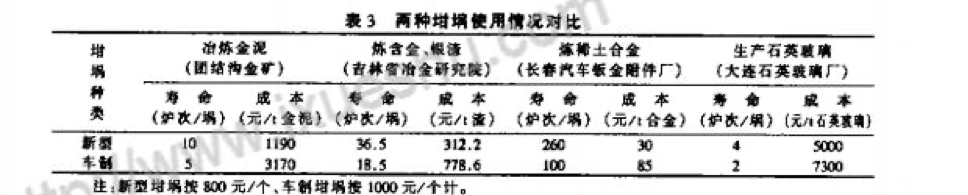 根據用戶(hù)反饋的情況,兩種中頻電爐坩堝的使用性能差別很大。新型石墨坩堝無(wú)砂眼、不滲漏;耐腐蝕性均勻,使用壽命長(cháng)而穩定。電極車(chē)制坩堝常出現砂眼和滲漏,并且無(wú)規則,使用壽命長(cháng)短不一.很難掌握冶煉爐次,經(jīng)常造成漏爐事故。兩種中頻電爐坩堝的使用情況對比見(jiàn)表3。