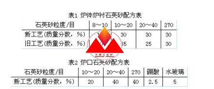石英砂的粒度配比及搗固方法影響爐襯的使用壽命,其主要影響爐襯的耐蝕性能和抗高溫沖擊性能。經(jīng)試驗,爐襯的抗侵蝕能力與其基體密度成正比,密度越大,基體組織越密,爐襯的抗侵蝕能力越強。在結合客戶(hù)實(shí)際生產(chǎn)的基礎上,采用表1所示的石英砂配方。爐口石英砂采用表2所示的改進(jìn)配方。